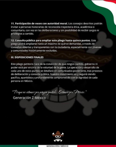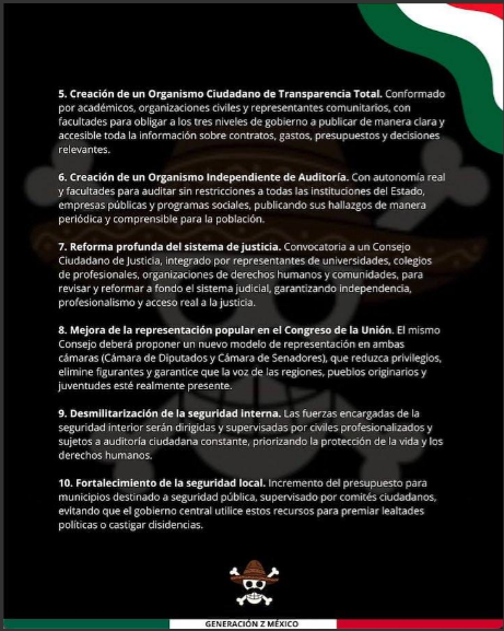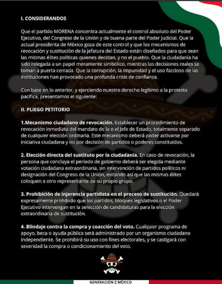 El movimiento Generación Z México dio a conocer un pliego de 12 puntos que resume sus principales demandas políticas y sociales, con el objetivo de abrir un diálogo nacional sobre mecanismos de participación ciudadana, transparencia y seguridad. El documento, que circuló en redes y fue retomado por distintos medios, se convirtió en el eje discursivo tras las movilizaciones realizadas en varias ciudades del país.