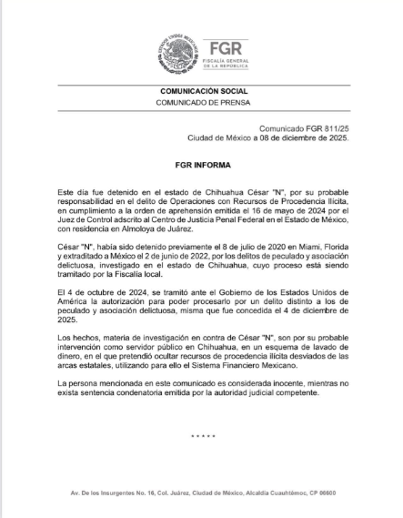De acuerdo a la versión de la FGR, César Duarte utilizó mecanismos bancarios para introducir en el circuito legal recursos provenientes de arcas estatales con el fin de darles apariencia de legalidad, lo que generó una orden de aprehensión emitida desde el 16 de mayo del 2024; sin embargo, las autoridades mexicanas no podían ejecutarla hasta recibir la autorización del gobierno de Estados Unidos, país que extraditó a César Duarte.