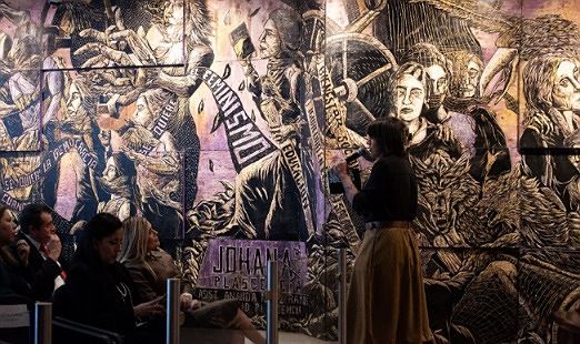 La artista incorpora además una alegoría de pájaros muertos que, hacia el final del muro, vuelan como símbolo del avance en las luchas sociales.