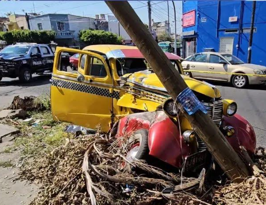 Dos vehículos se detienen, un peatón cruza y la unidad oficial aparece a alta velocidad, se atraviesa sin advertencia y se lleva de encuentro a un automóvil clásico —un Chevrolet 1938, restaurado, con valor económico e histórico—. La patrulla termina estrellada contra el poste del semáforo.