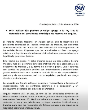El Partido Acción Nacional (PAN) en Jalisco fijó su postura tras la detención del presidente municipal de Tequila, emanado de Morena, y sostuvo que la acción de las autoridades era necesaria ante la gravedad de los señalamientos por presuntos actos de extorsión que pesan sobre el edil.