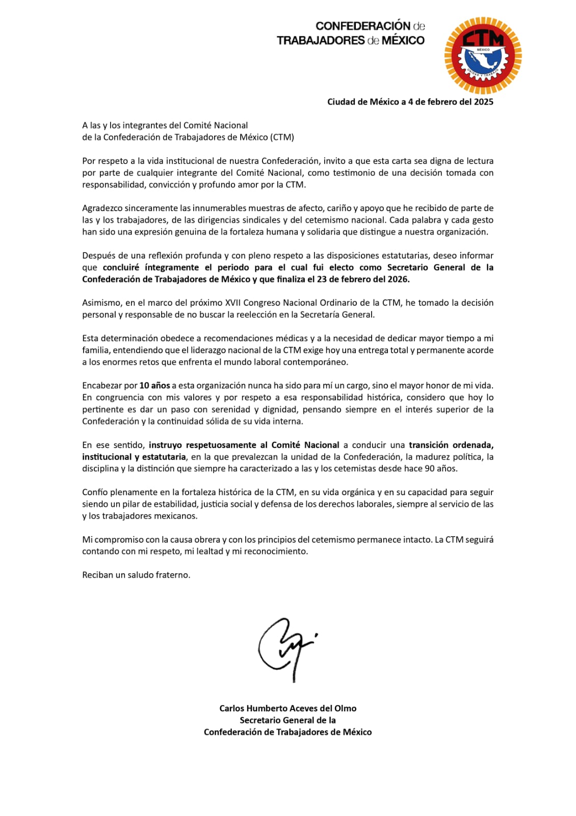 Durante los últimos diez años, Carlos Aceves del Olmo ha estado al frente de la Secretaría General de la CTM y el próximo 23 de febrero ha anunciado su retiro, al vencer el periodo para el que fue electo.