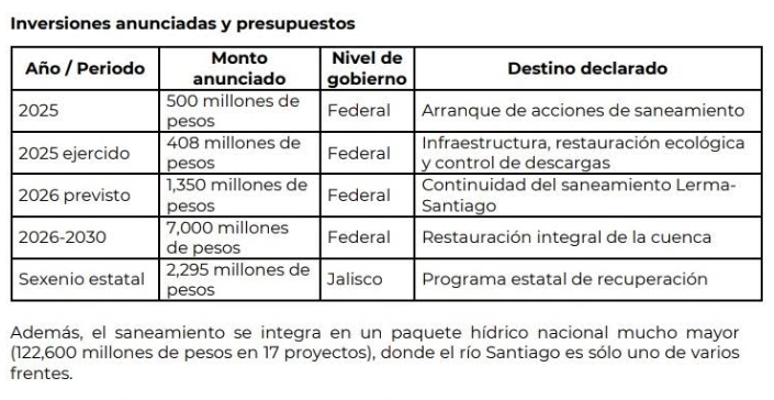 Empezó diciendo que la asignación presupuestal multianual identificable para 2025-2030, representa un avance significativo frente a años de rezago institucional. Además, el saneamiento se integra en un paquete hídrico nacional mucho mayor (122,600 millones de pesos en 17 proyectos), donde el río Santiago es sólo uno de varios frentes.