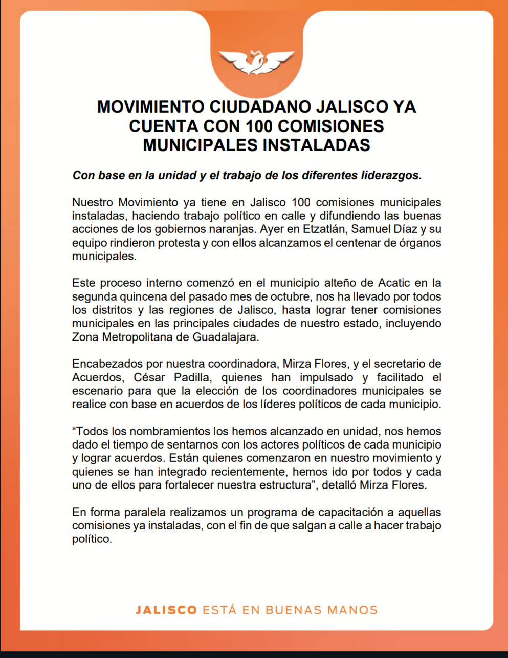 Movimiento Ciudadano en Jalisco alcanzó la instalación de 100 comisiones municipales, con lo que fortalece su presencia territorial y organización interna en todo el estado.