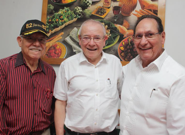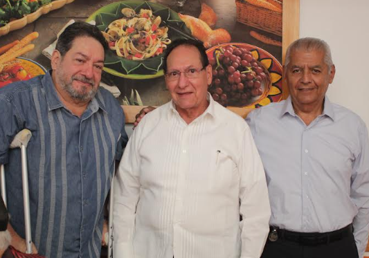 El gran José I. López y Alberto Bautista con el festejado. Llueva, truene o relampaguee, no pueden faltar este día para darle el abrazo al gran amigo.