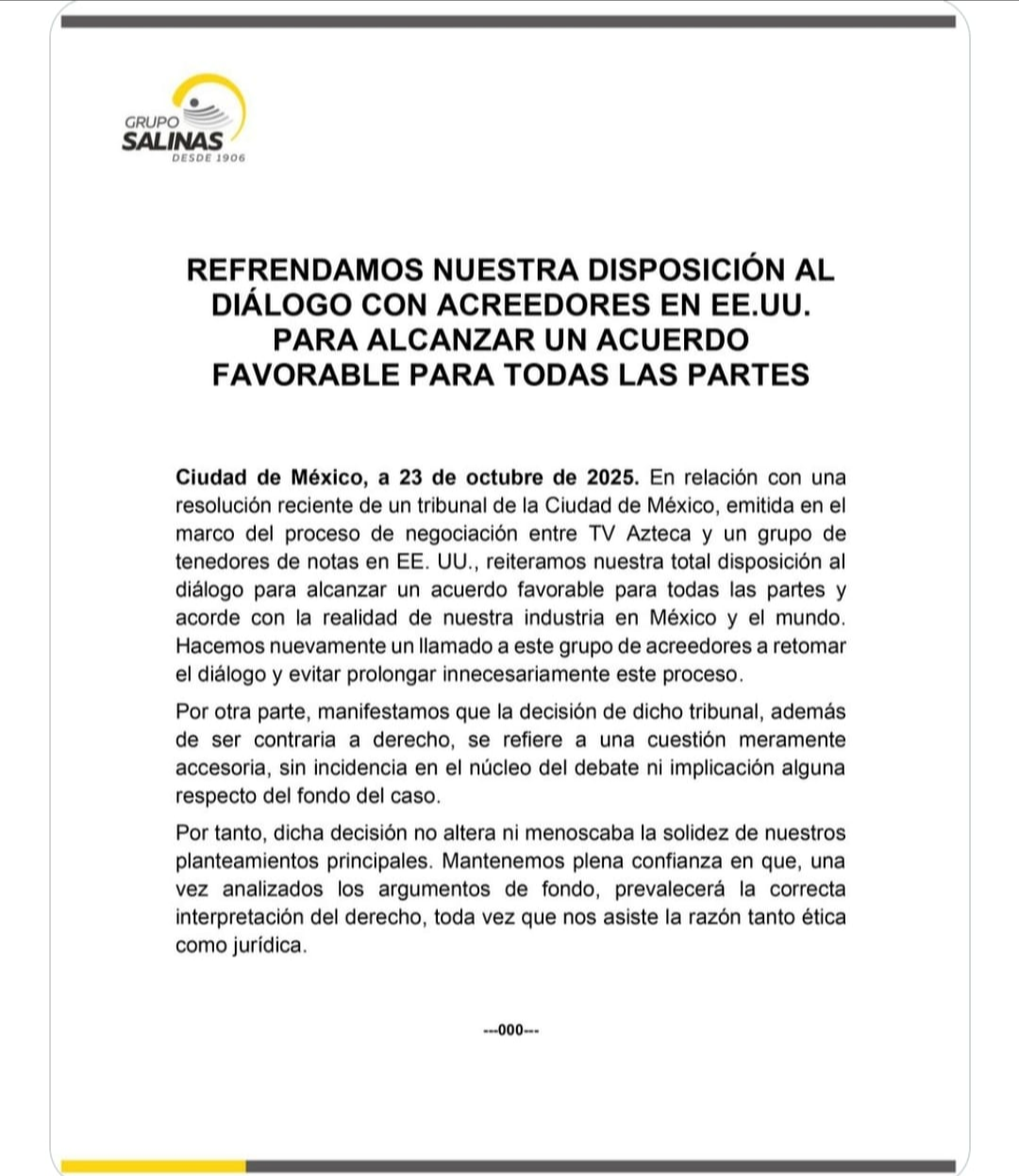 Mediante un comunicado divulgado a través de sus redes sociales, Salinas Pliego pide también a sus acreedores, que el acuerdo es con el fin de evitar prolongar innecesariamente el proceso y que resulte “acorde con la realidad de nuestra industria en México y en el mundo”.
