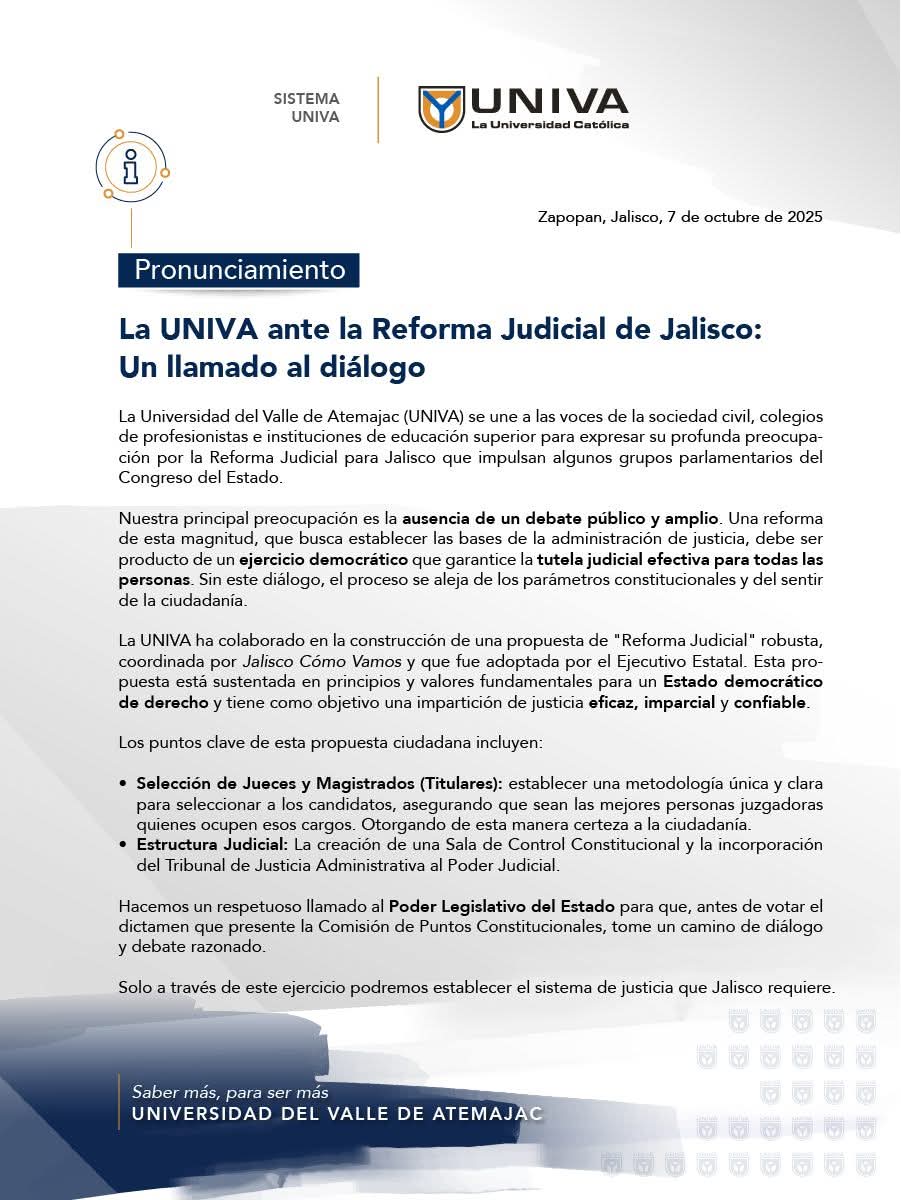 La Universidad del Valle de Atemajac (UNIVA) lanzó un pronunciamiento contundente contra la manera en que se está impulsando la Reforma Judicial en Jalisco y advirtió sobre la “ausencia de un debate público y amplio” y se unió a las voces de la sociedad civil, colegios de profesionistas e instituciones educativas que observan con preocupación que la propuesta avance sin considerar la pluralidad de visiones que requiere un cambio de esta magnitud.