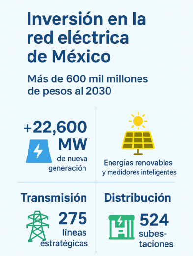 El Gobierno de México y la Comisión Federal de Electricidad (CFE) anunciaron un ambicioso plan de 624 mil millones de pesos —equivalente a casi 33 mil millones de dólares— para modernizar y expandir la red eléctrica nacional entre 2025 y 2030. Se trata de la inversión más grande en infraestructura energética de las últimas décadas, destinada a garantizar la confiabilidad del sistema y responder a la creciente demanda derivada del nearshoring.