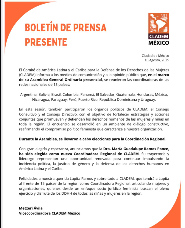Lupita Ramos aceptó el nombramiento, que estuvo acompañado de mucha alegría y felicitaciones de la comunidad defensora de los derechos de las mujeres y deseando que esta nueva etapa esté llena de logros y avances para los derechos de las mujeres de toda América Latina y el Caribe.