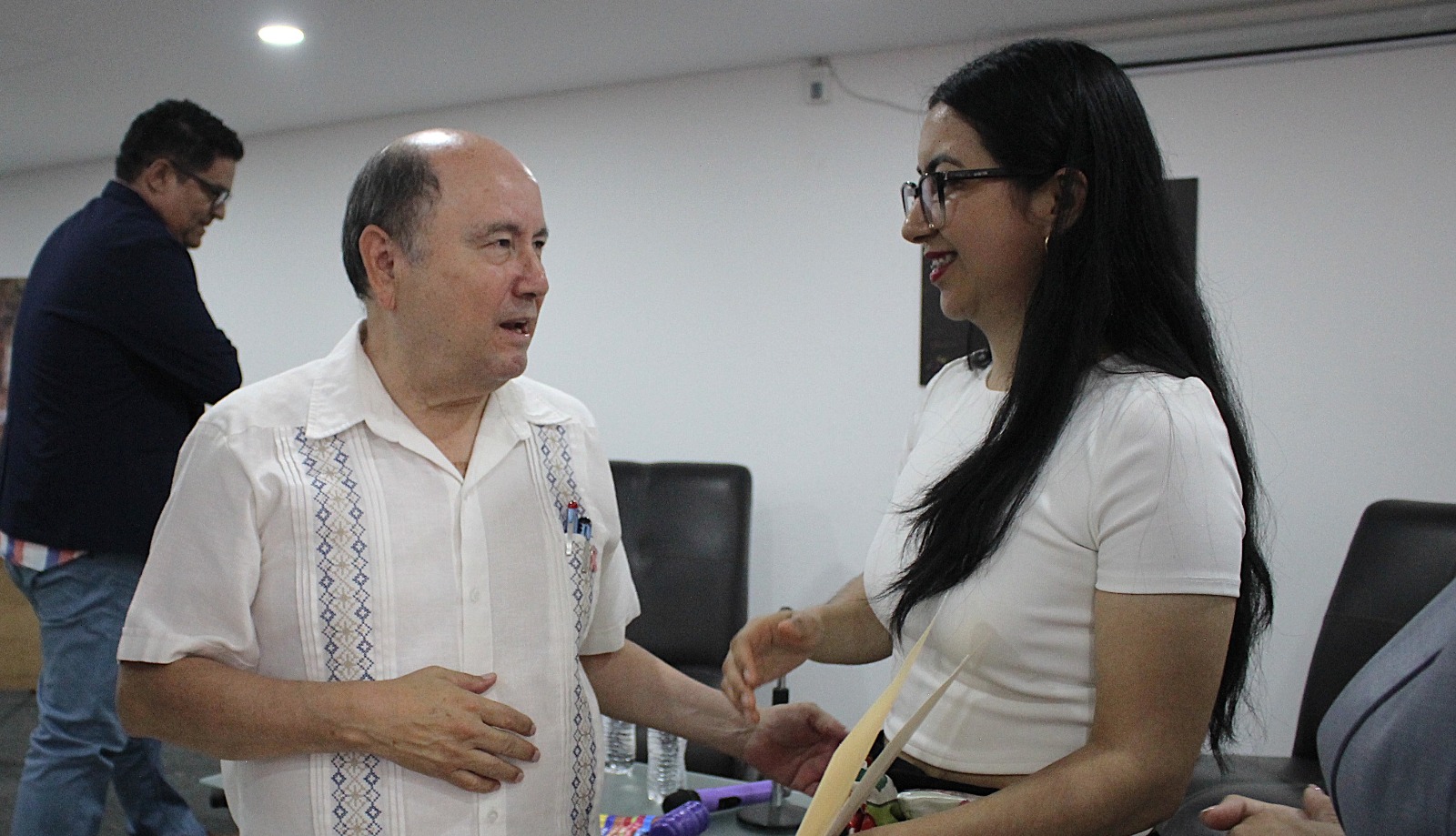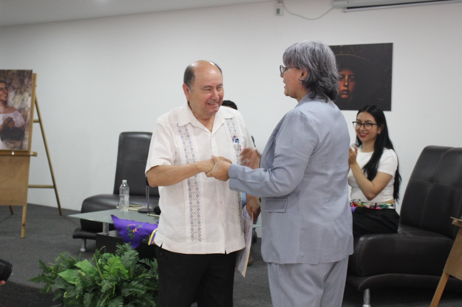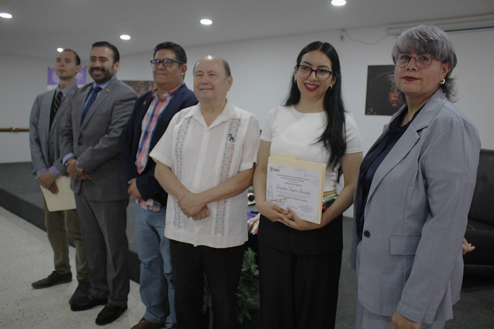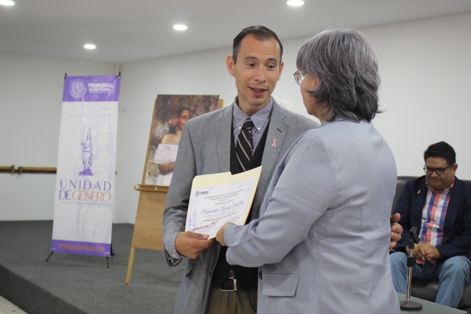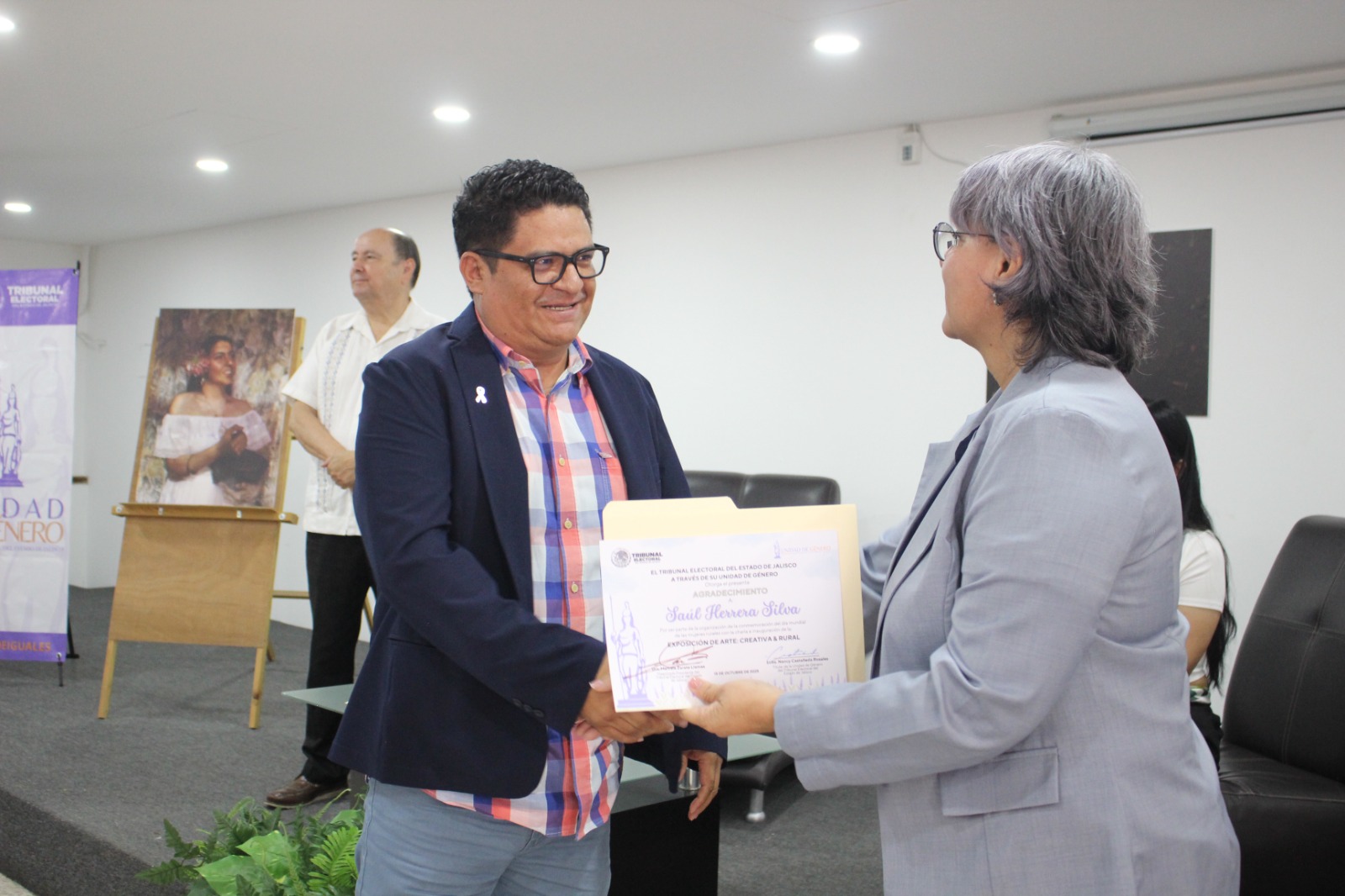 Alejandro Gómez Trujillo, organizador de la exposición de Brenda Tapia, recibe la entrega del reconocimiento de manos de la presidenta del TEEJ, magistrada Marcela Zárate.