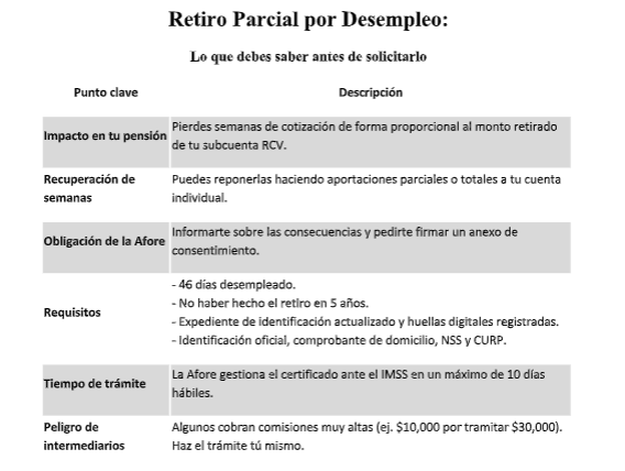 Cuando un trabajador ejerce el retiro parcial por desempleo, el IMSS efectuará un descuento proporcional de semanas de cotización. Es decir, no solo disminuye el saldo de tu cuenta individual, también pierdes parte de tu historial laboral registrado, lo cual es determinante para calcular el monto y la viabilidad de tu pensión.