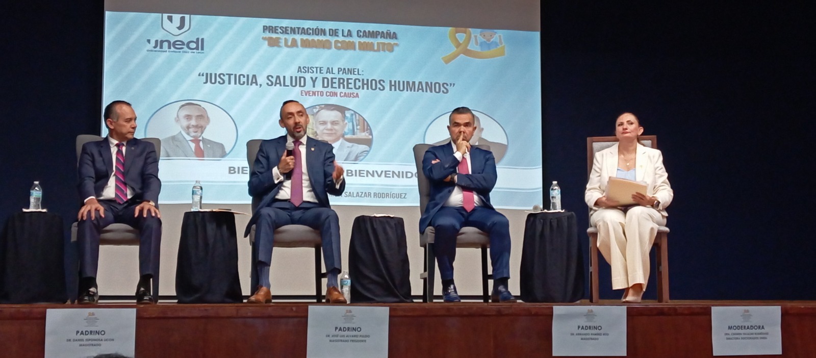 El panel, moderado por la maestra Carmen Salazar Rodríguez, contó con la presencia de los magistrados del Supremo Tribunal de Justicia José Luis Álvarez Pulido (presidente), Armando Ramírez Rizo y Daniel Espinoza Licón, quienes compartieron su experiencia en la defensa del derecho a la salud desde el ámbito judicial.